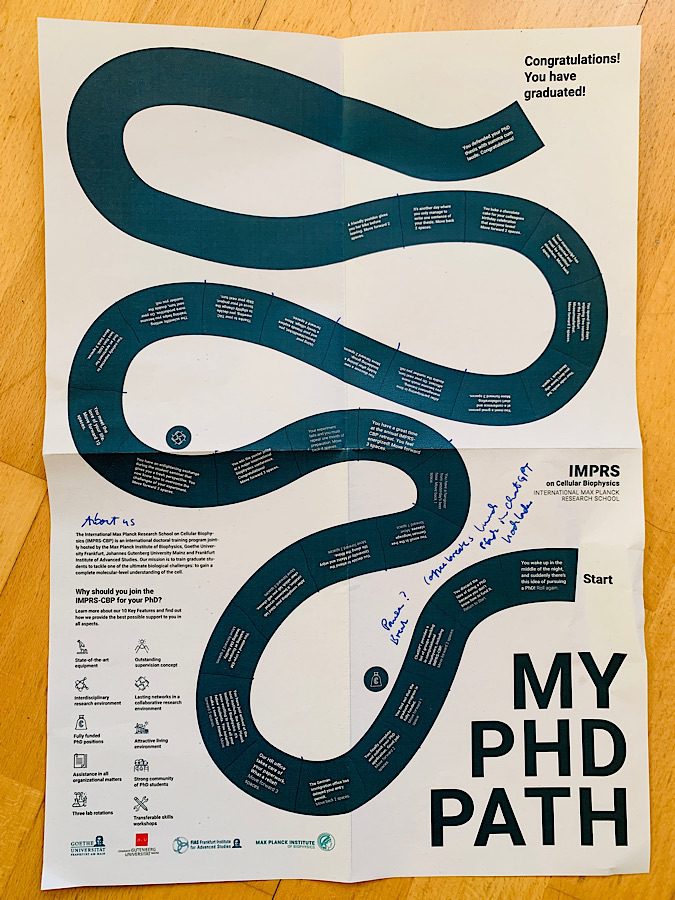 Another project I started was the flyer for the graduate school. To make it fun, I designed a fold-out poster in the style of a board game that illustrates the typical course of a doctoral program, from the decision to pursue a doctorate to graduation, with all its ups and downs, based on real-life examples. The goal is to inform potential doctoral students about the benefits of the program in an entertaining way. The poster needs to be visually appealing enough that people will want to hang it on their wall. I already looked for game pieces in the program’s colors and a golden dice. 😊